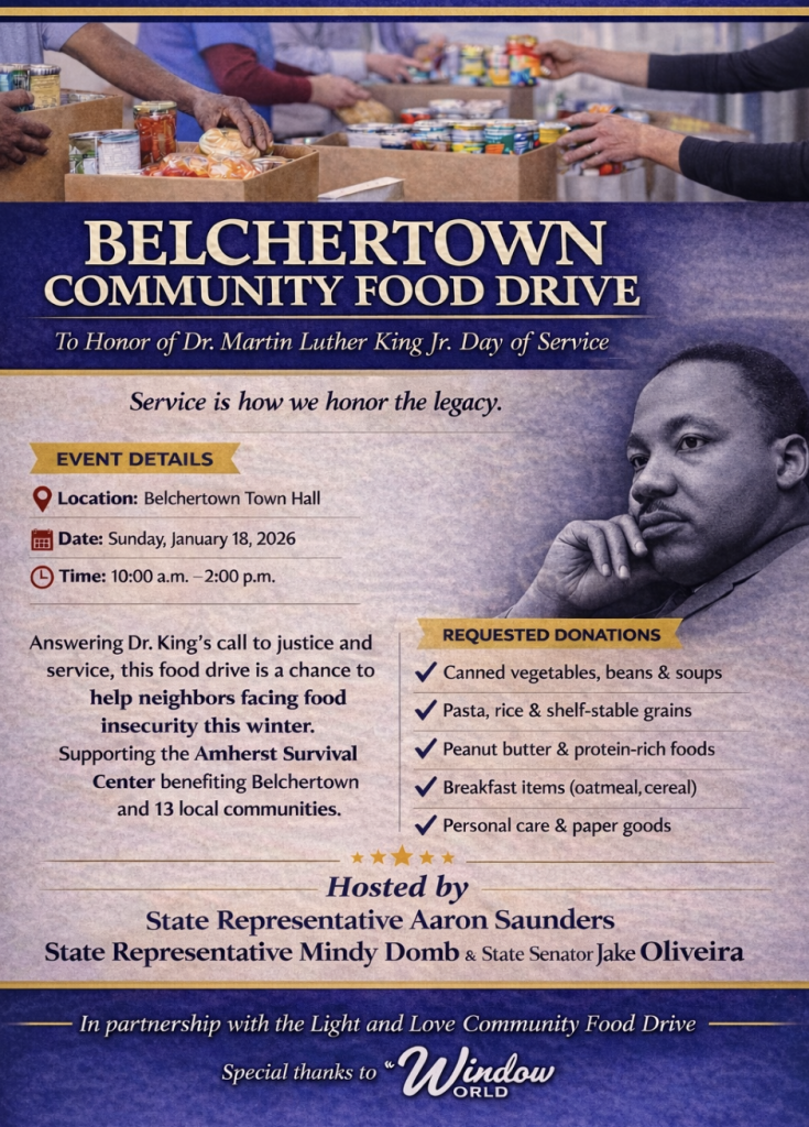We are thrilled that this year, Representative Aaron Saunders (D-Belchertown) will be leading a Belchertown “feeder” (!) drive the day before on Sunday, January 18 from 10am-2pm at the Belchertown Town Hall parking lot. Belchertown is one of the 13 towns served by the Amherst Survival Center food pantry.
